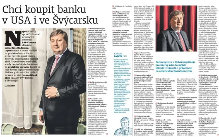 Největší český zprostředkovatel devizových obchodů SAB Finance zlínského miliardáře Radomíra Lapčíka letos v lednu vstoupil na pražskou burzu. Zatím se mu povedlo upsat zhruba polovinu plánovaného objemu akcií. Ty patří mezi nejdražší a tedy i nejméně obchodované na pražském parketu. Lapčík se tedy kromě výplaty mimořádné dividendy akcionářům rozhodl na začátku září pro rozdělení akcií tak, aby byly levnější a více likvidní. Kromě toho se chystá vstoupit na americký i švýcarský bankovní trh.