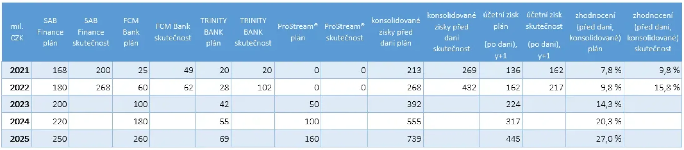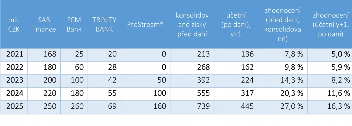 Následující tabulka ilustruje předpokládané zisky před zdaněním jednotlivých společností (podíl náležející SAB Finance). Tabulka zároveň ukazuje zhodnocení investice na úrovni případné konsolidace, účetní zhodnocení počítá se zdaněním a ročním zpožděním přijetí dividendy a zahrnutí výsledku SAB Finance daného roku z důvodu výplaty dividend z kapitálových účastí ve společnostech.